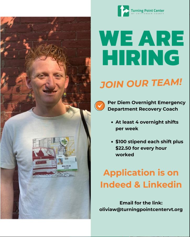 Join Turning Point Center of Chittenden County’s Emergency Department Recovery Coaching team! We’re seeking compassionate people with 3+ years in sustained recovery to support patients at UVMMC who are struggling with substance use.